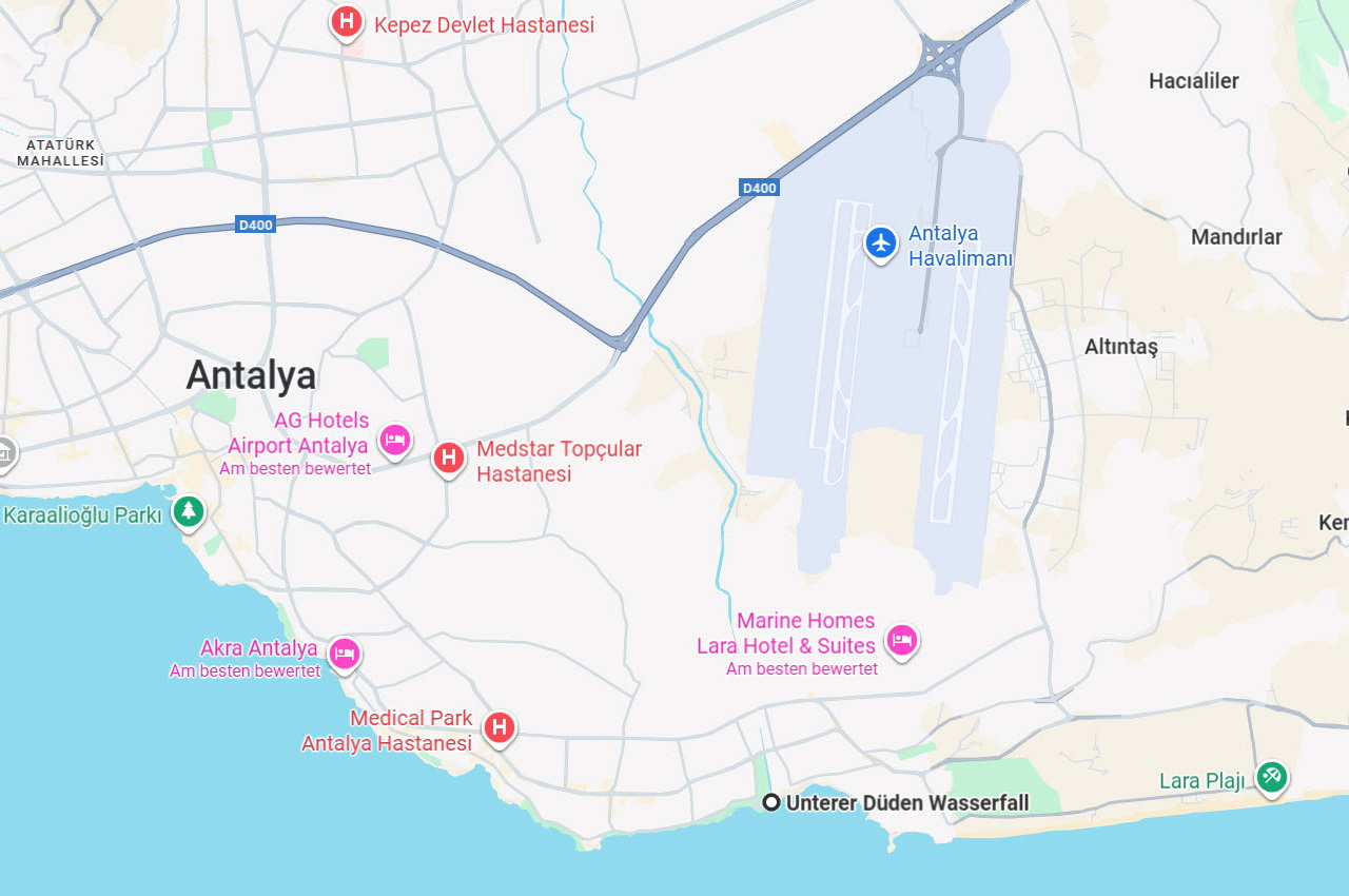 Der Fluss Düden entspringt im Taurusgebirge, circa 30 km von Antalya entfernt. Er fließt durch die Stadt Antalya und spaltet sich in zwei Wasserfälle auf – die Düden Wasserfälle. Der obere Düden Wasserfall liegt in einem kleinen Naturpark, während der untere Düden Wasserfall direkt an der Küste über einen Felsen ins Mittelmeer stürzt.